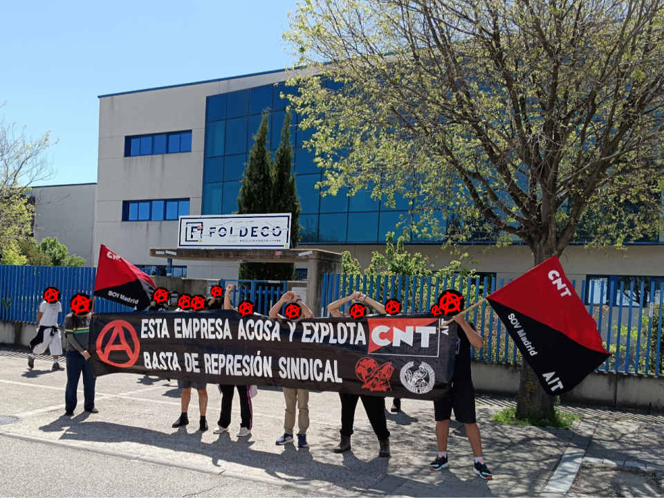 El pasado 26 de abril, un grupo de militantes de la CNT-AIT madrileña se concentraron de nuevo frente a las puertas de la empresa Foldelco, ubicada en el polígono empresarial Carpetania (Getafe).