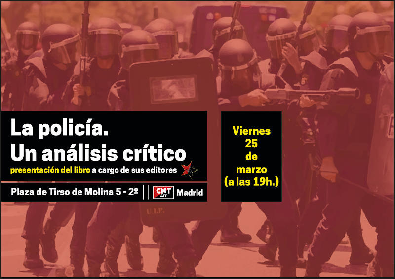 El próximo viernes 25 de marzo les compas de la editorial La Neurosis o Las Barricadasestarán en nuestros locales de Tirso de Molina para presentar su última publicación, «La policía. Un análisis crítico». Como dicen sus editores, «este texto pretende contribuir a llenar un curioso vacío: el estudio de los cuerpos policiales. (…) resulta llamativa la escasa producción de estudios científicos sociales sobre esta institución. ¿No existe interés por el estudio de los cuerpos del orden? ¿Es su hermetismo el motivo de esta escasez de estudios? ¿O es posible que se trate de un objeto incómodo de estudio por su poder?