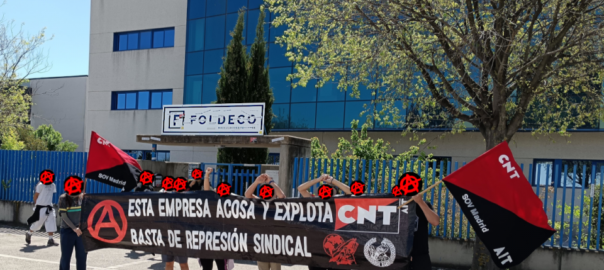 Se concentraron allí para mostrar solidaridad con un compañero del sindicato que ha sufrido tratos vejatorios por parte de esta empresa, hasta el punto de llegar a la agresión física, simplemente por no querer doblegarse ante la falta de unos derechos mínimos. Esos derechos nos pertenecen a los trabajadores, pero ya sabemos que para determinada gente parece que las garantías laborales son simplemente un obstáculo para poder explotar mediante el sufrimiento y la coacción a los trabajadores, para incrementar su poder y reafirmarse en su mediocre avaricia. Lo más lamentable es que sean jefecillos y pelotillas quienes también agredan a nuestro compañero, pero, lamentablemente para ellos, nuestro compañero jamás estará solo: estaremos unidos ante la explotación en Foldeco denunciando sus irregularidades: